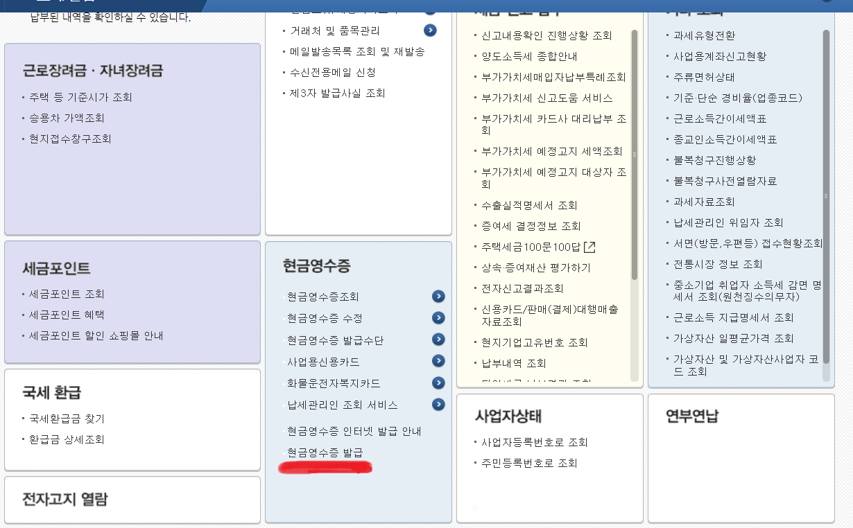 현금영수증의 현금영수증 발급을 눌러줍니다.