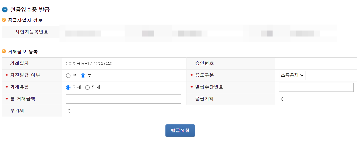 현금영수증의 현금영수증 발급을 눌러줍니다.