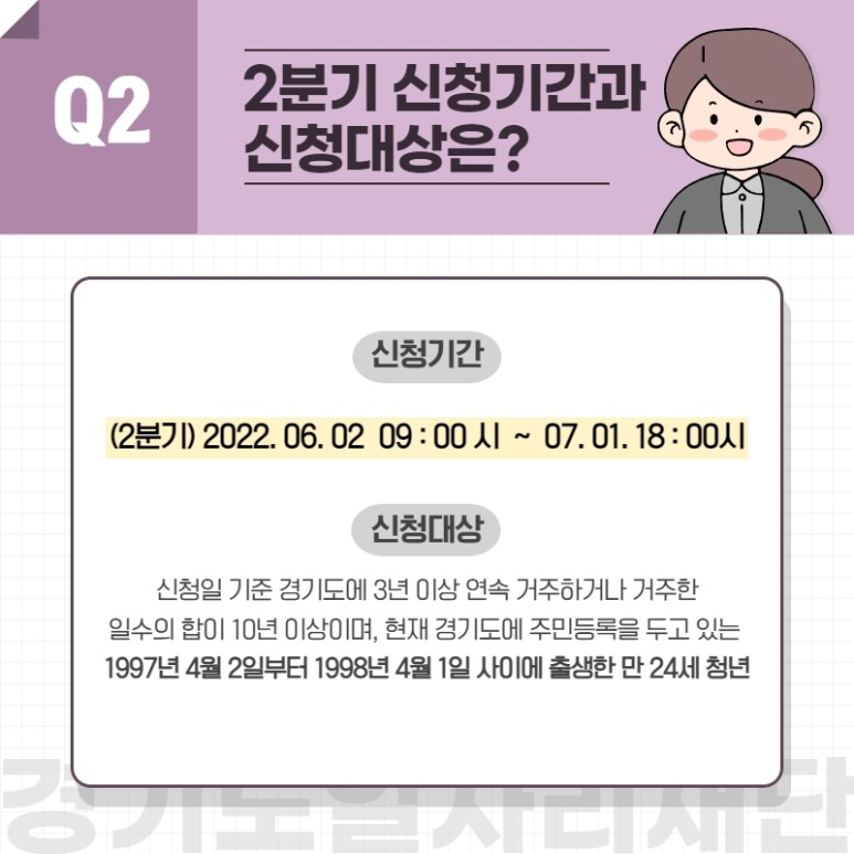 신청기간은 6월 2일부터 7월 1일까지이며, 현재 경기도에 주민등록을 두고 있는 1997년 4월 2일부터 1998년 4월 1일 사이에 태어난 만 24세 청년 대상입니다.