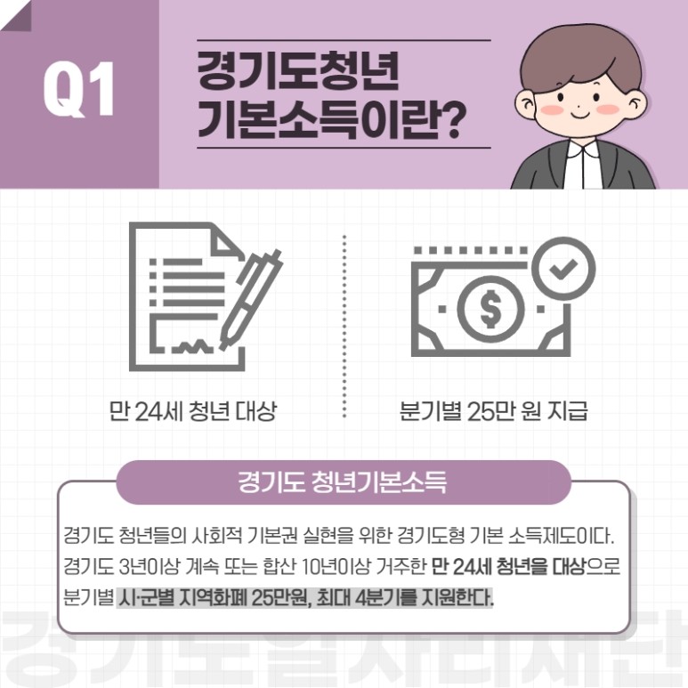 경기도에서 3년 이상 또는 합산 10년 이상 거주한 만 24세 청년을 대상으로 분기별 시. 군별 지역화폐로 25만 원,