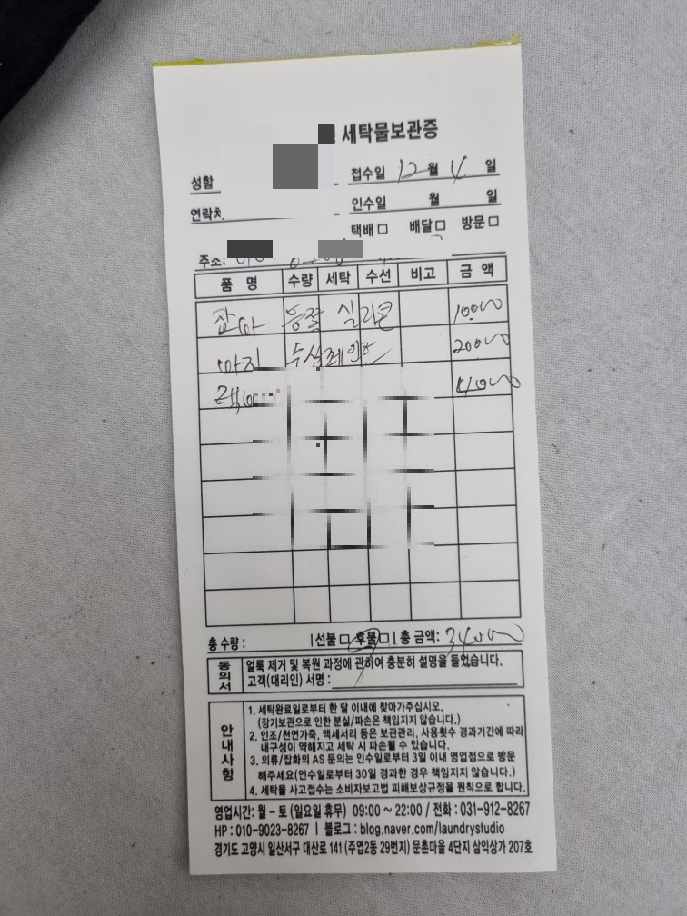세탁물 작업기간은 2주정도 걸린다고 하셨어요.