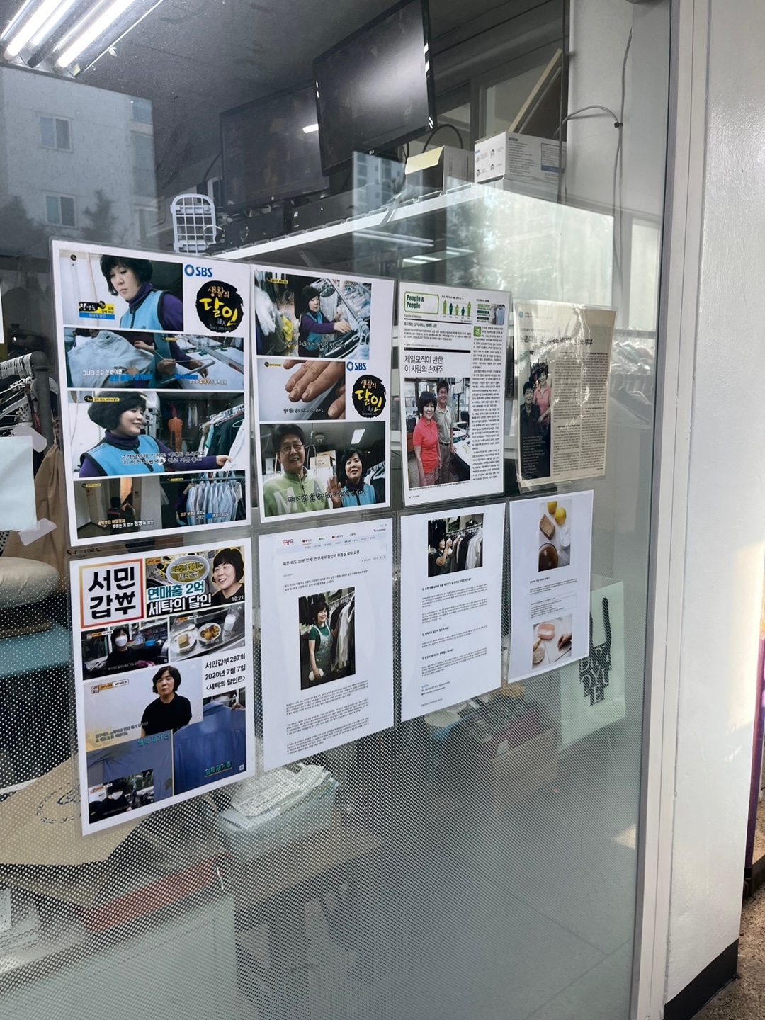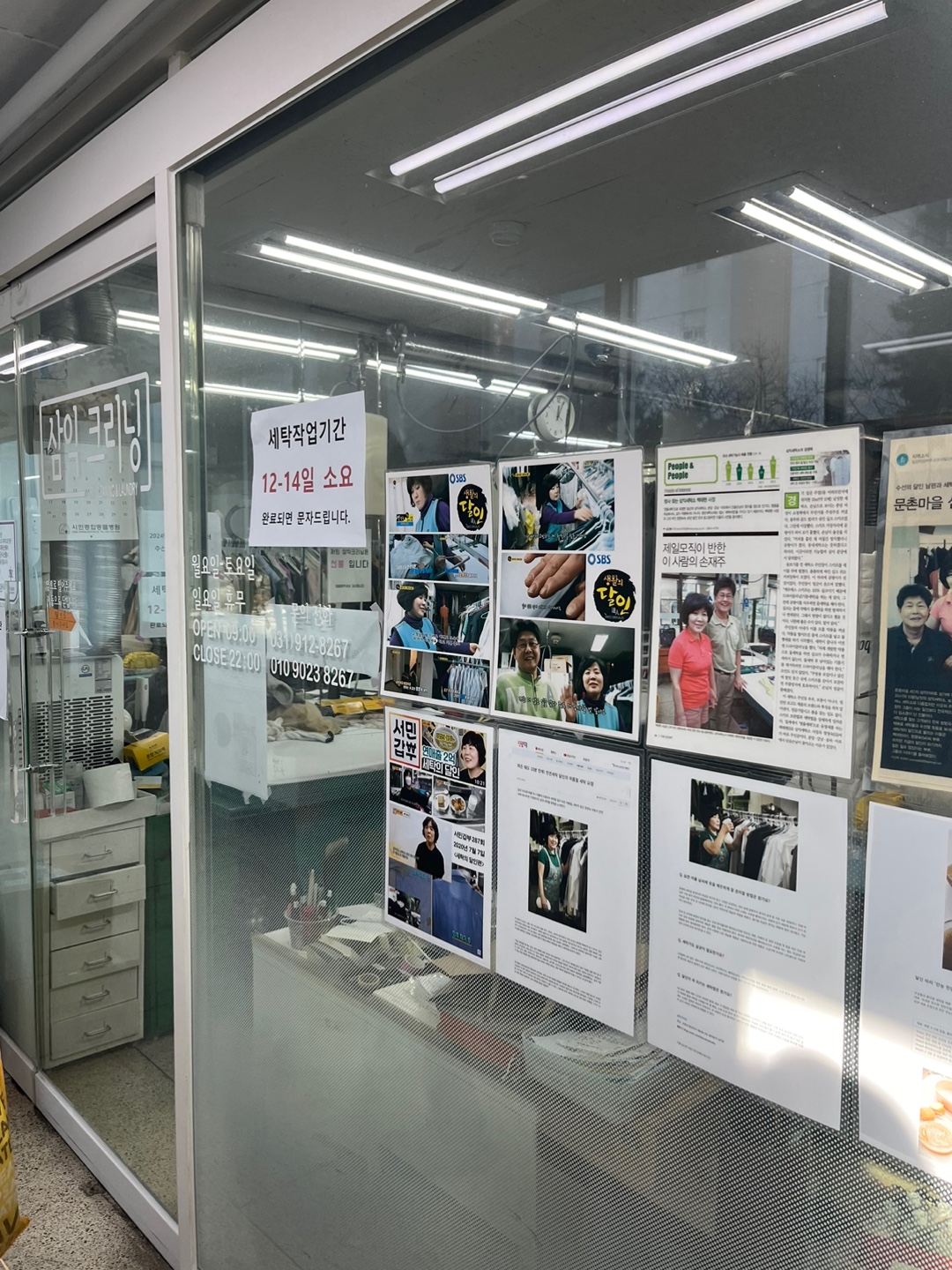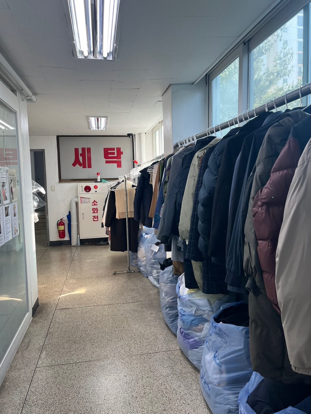 세탁소 입구부터 세탁물들이 쌓여 있었어요.