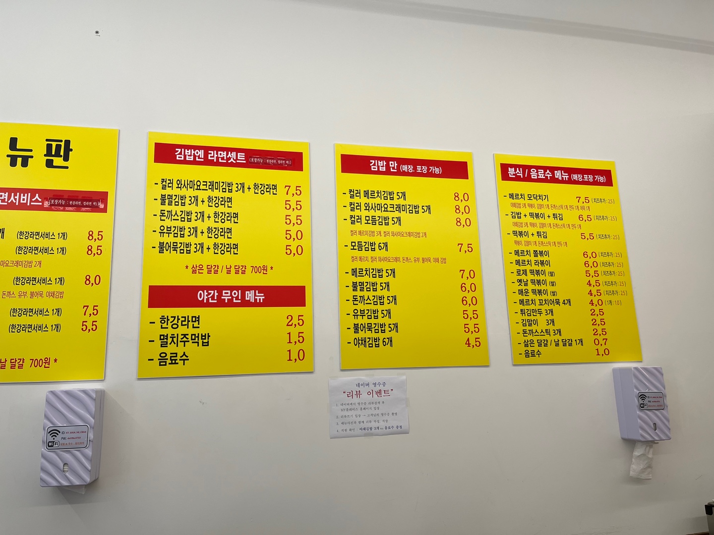 한강라면과 컬러김밥 셋트 가격도 참 좋았어요.