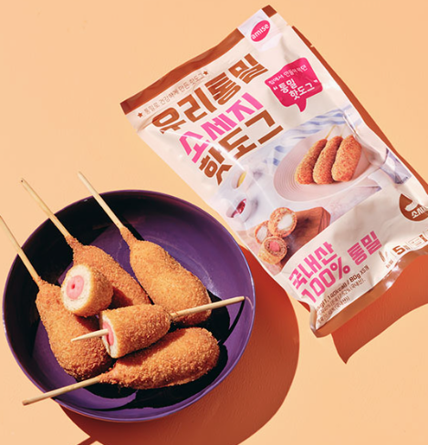 오아시스의 냉동 핫도그는 국내산 통밀로 만든 핫도그입니다.