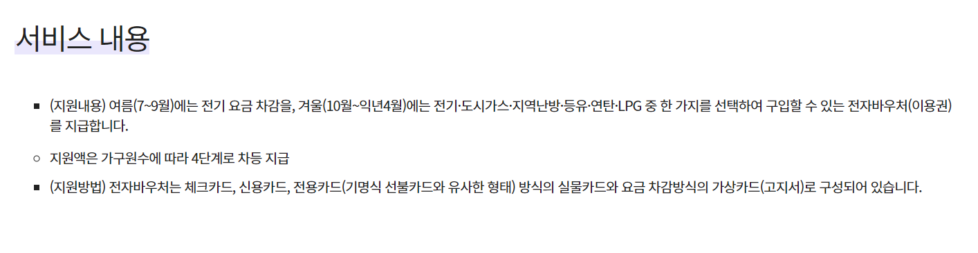 취약계층을 위해 에너지 바우처(이용권)를 지급하여 전기, 도시가스, 지역난방, 등유, LPG, 연탄을 구입할 수 있도록