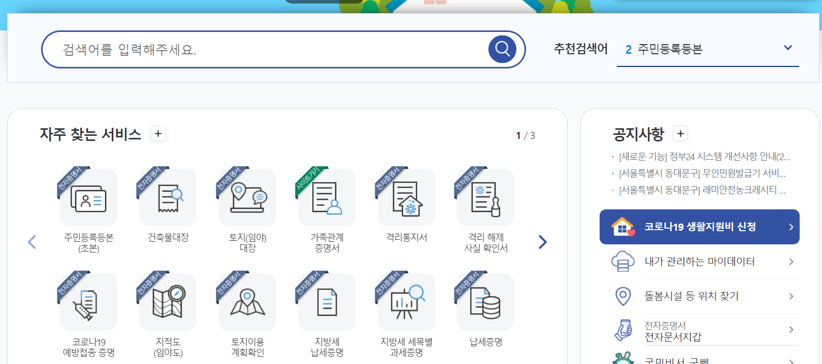 정부 24에 접속해서 메인에 있는 건축물대장을 클립합니다.