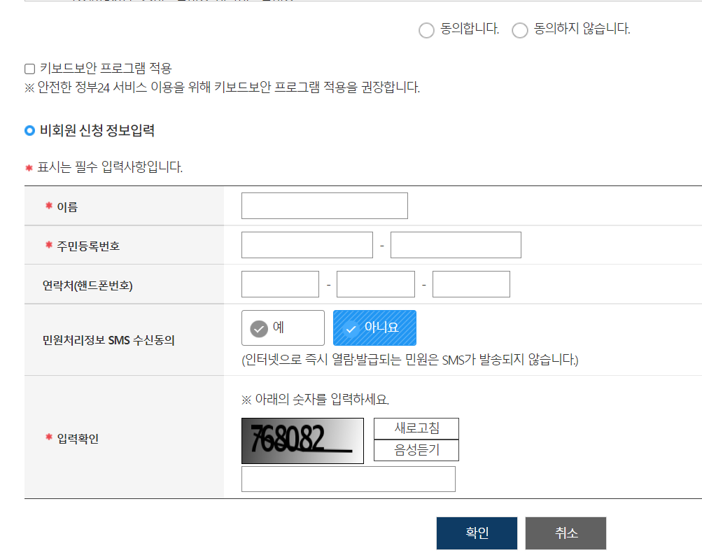 비회원으로 신청하게 되면, 개인정보를 입력하는 공간이 나옵니다.