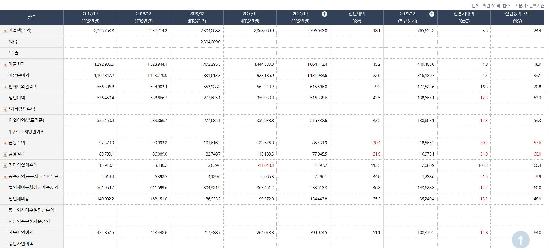 제일 위에 각 해의 매출액이 적혀있고