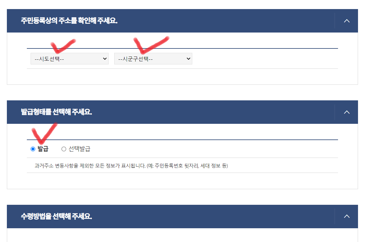 시, 도, 군을 선택한 후 발급 or선택 발급을 체크합니다.