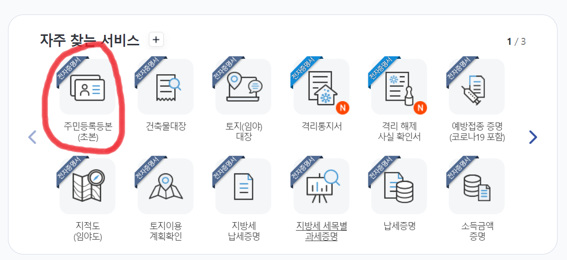 자주 찾는 서비스에 주민증록 등본(초본)을 클릭합니다.