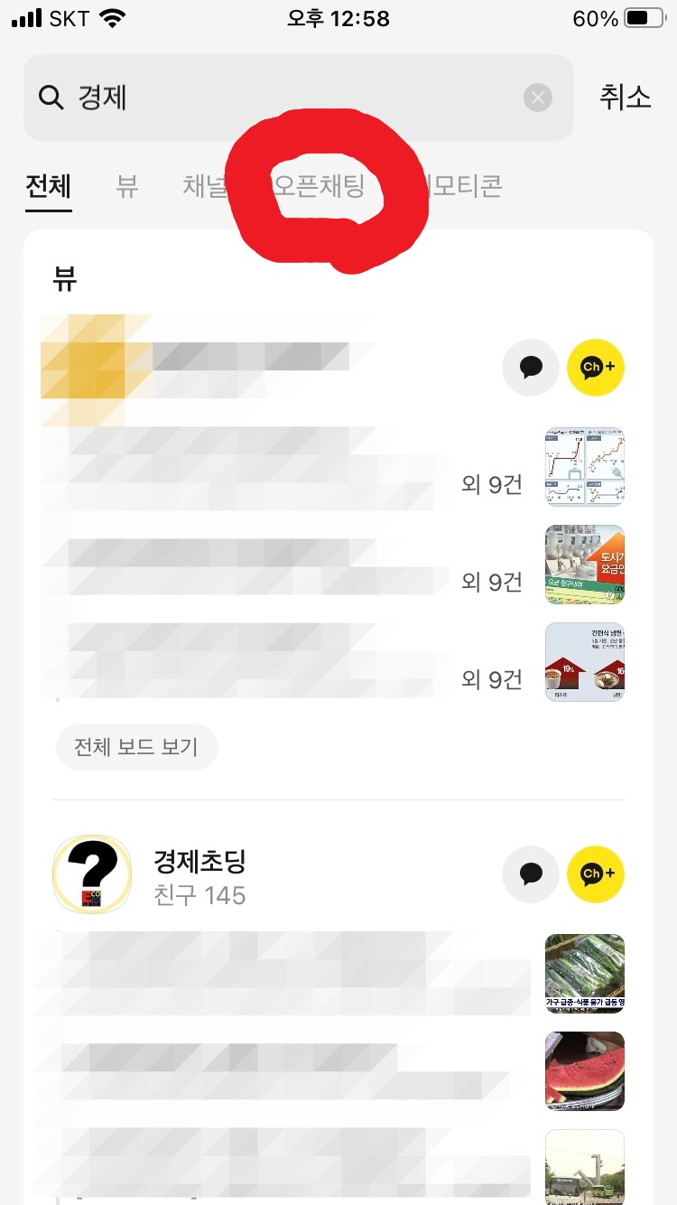 뷰탭을 누르면 이러한 화면이 나타나는데요, 뷰 탭에서 오픈 채팅방을 클릭한 후 나의 관심사를 검색하면