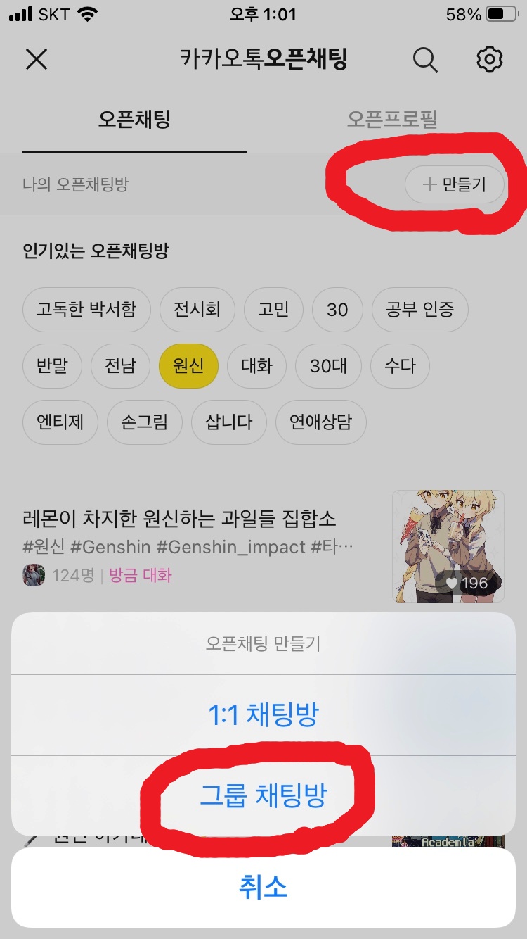 오픈 채팅방에 들어가는 방법은 이처럼 간단한데요~! 오픈 채팅방을 만드는 방법도 간단합니다.!