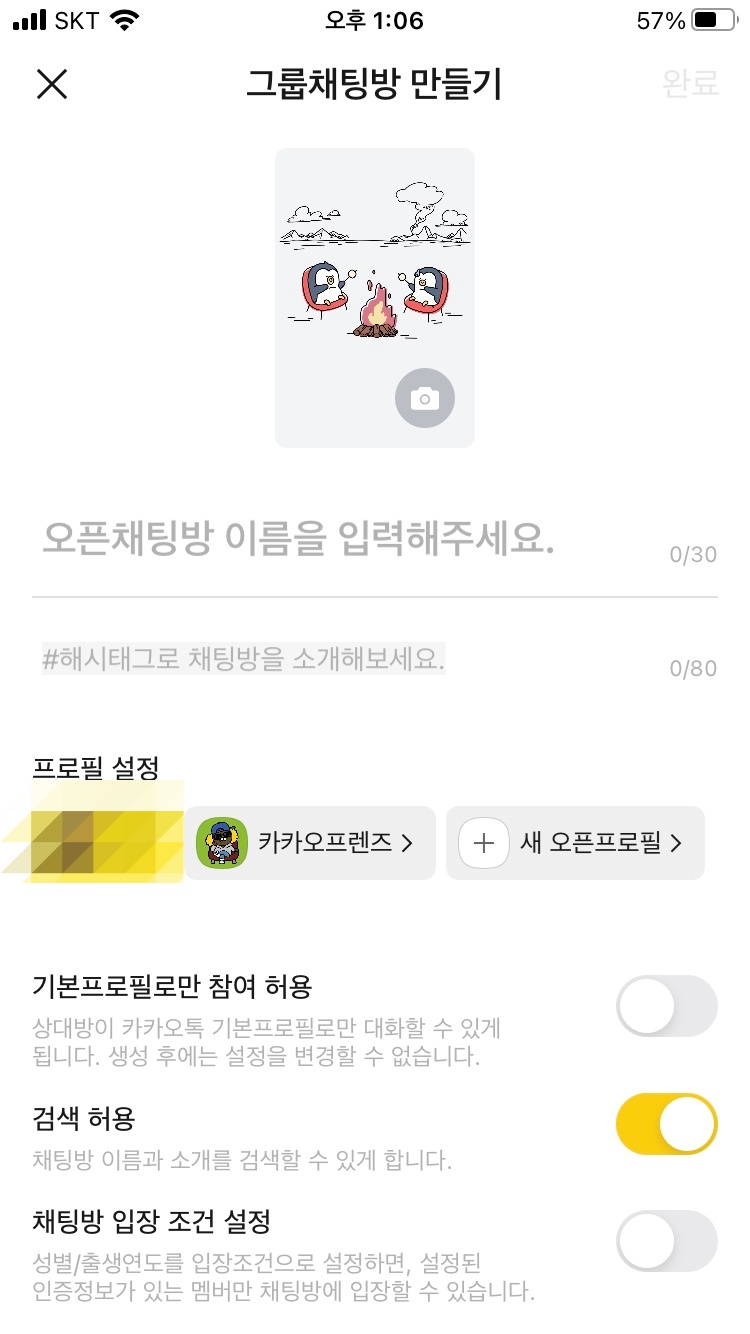 오픈 채팅방 이름을 입력하고 해시태그 등도 입력합니다. 검색 허용 여부와 프로필 등을 설정합니다.