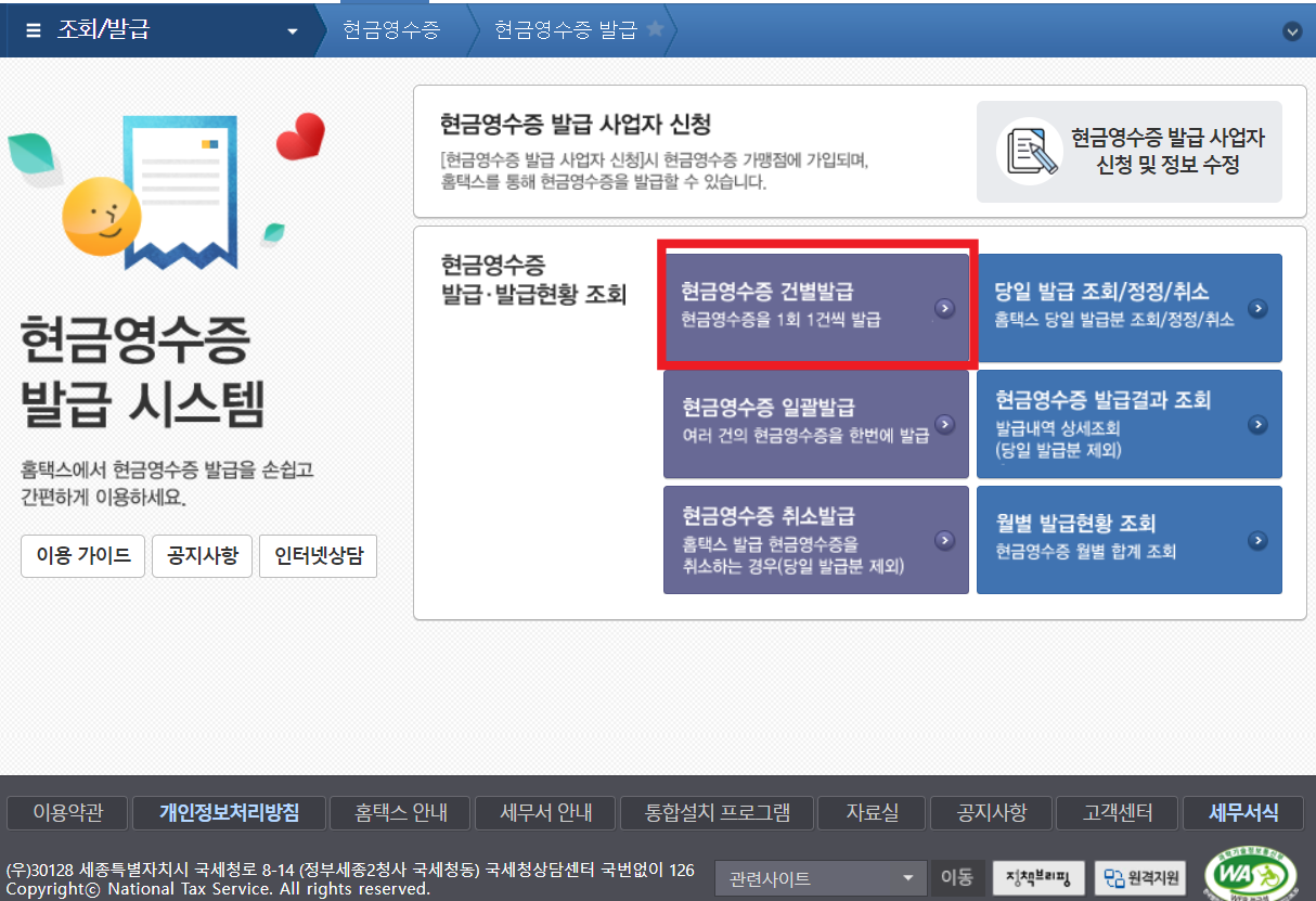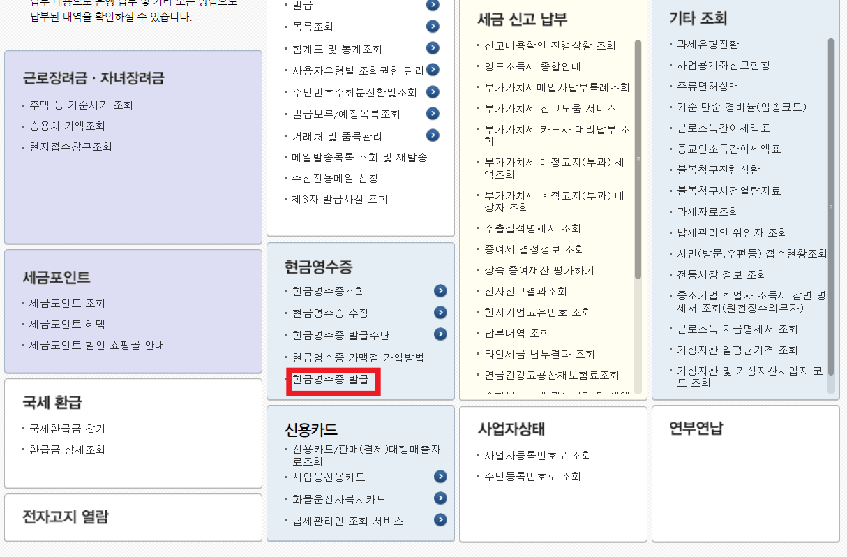 현금영수증 발급 란을 클릭합니다.