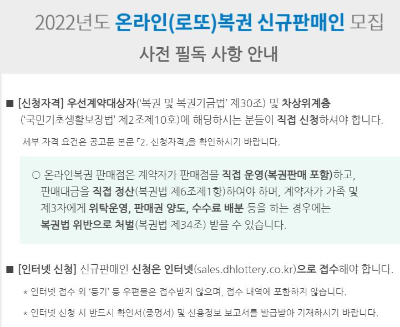 신청방법 : (주)동행 복권 홈페이지 내 [판매인 모집공고]를 통한 인터넷 신청.