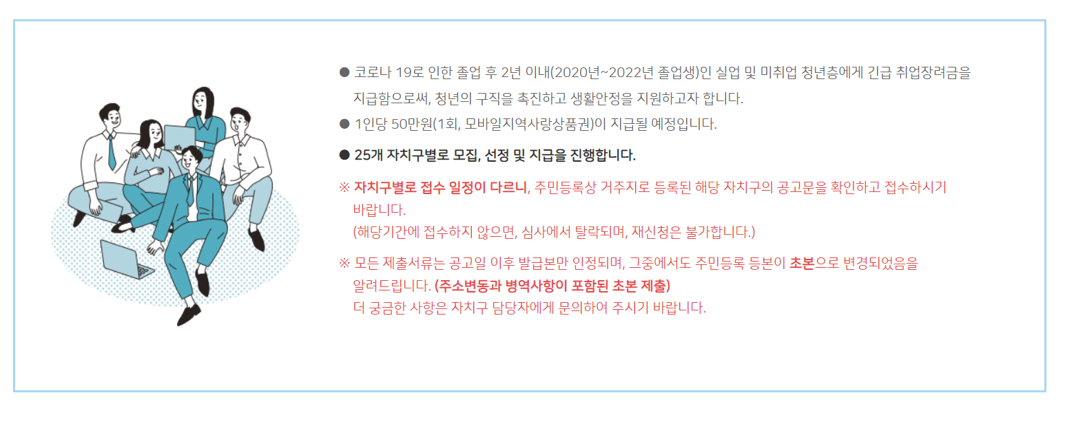 - 서울시 25개 자치구별로 모집, 선정 및 지급을 진행.